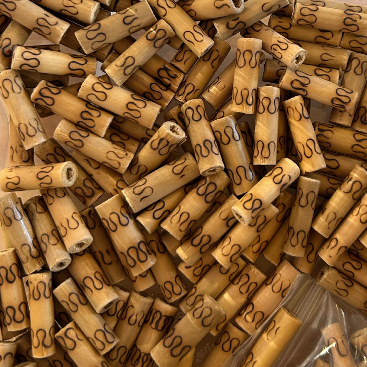 Bamboestaafjes bewerkt met golfjes erop, ca. 16mm met een gatmaat van ca. 1,5mm, dikte varieert van 3,5 tot 5,5 mm. Bamboe is een natuurlijk produkt waardoor elke kraal anders is van kleur en maat, verkrijgbaar per streng van ca. 50 stuks.
