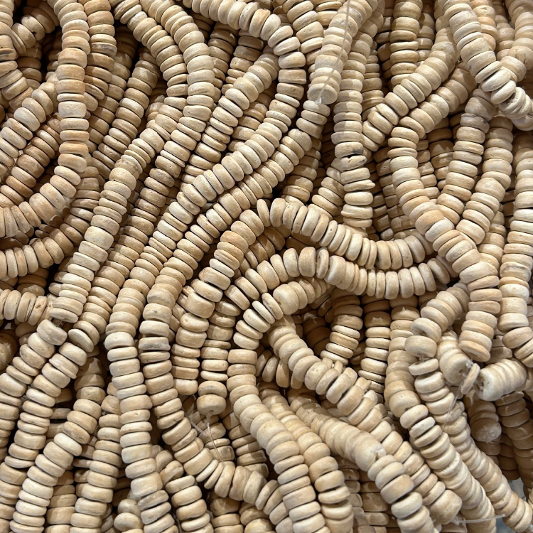 Kokosschijfjes, maat ca. 7/8mm met een gatmaat van 0,5mm in mooie natuurlijke tinten. Het kokos is een natuurlijk produkt waardoor elke kraal anders is van kleur en maat, verkrijgbaar per streng van ca. 125 stuks.